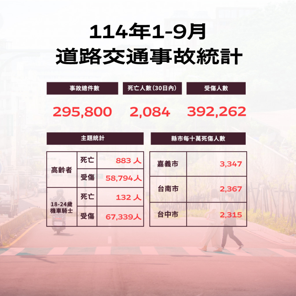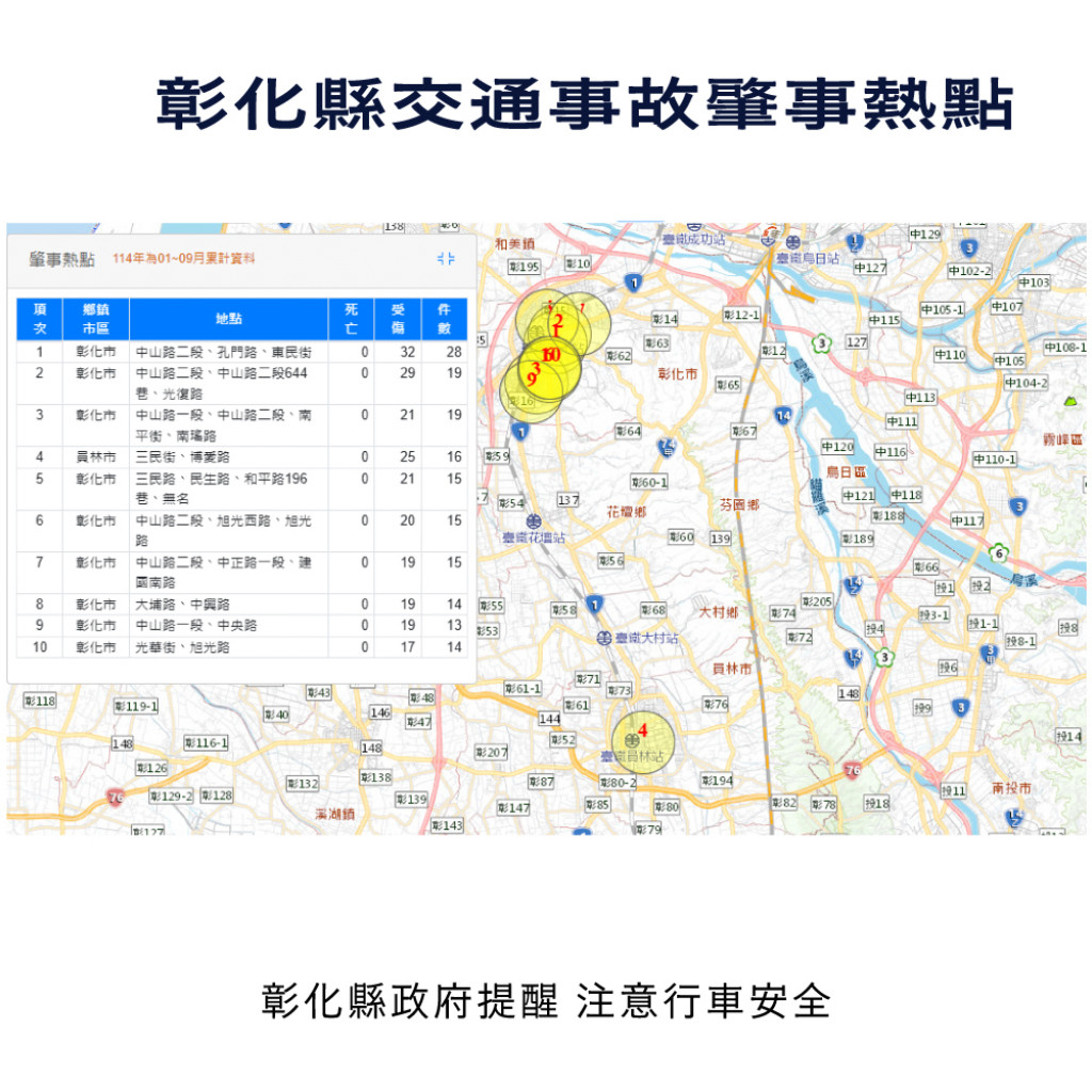根據交通部道安資訊查詢網,本縣114年1-9月道路交通事故與112年同期比較分析,以少年自行車騎士(含電自、電輔) 事故增加45%最高,外籍人士事故增加34.3%次之,自小客車駕駛人增加26%再次之。1-9月份鄉鎮市30日死亡人數於「彰化市、員林市、二林鎮」為多,肇事熱點以「彰化市」為多。