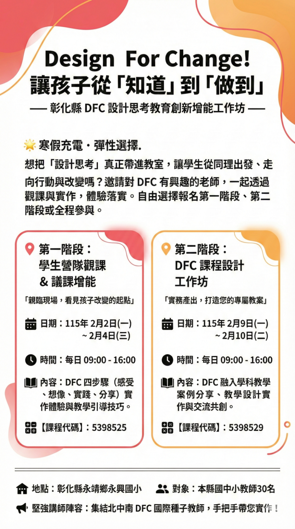 彰化縣永靖鄉永興國小辦理「DFC設計思考教育創新增能工作坊」 ,鼓勵所屬教師參加。
