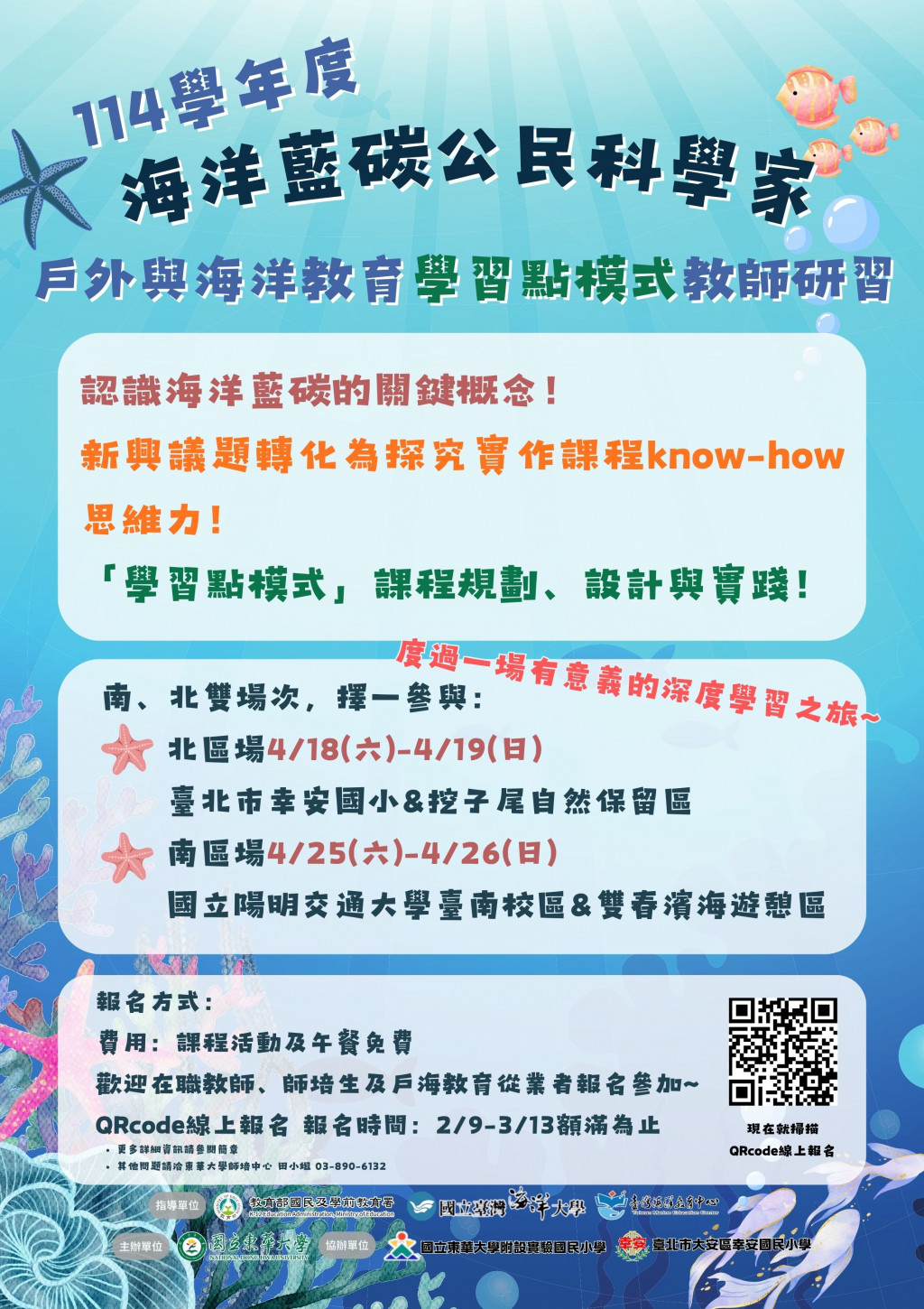 2、南區場次:115年4月25日(星期六)至4月26日(星期日),地點:國立陽明交通大學臺南分部及雙春濱海遊憩區。